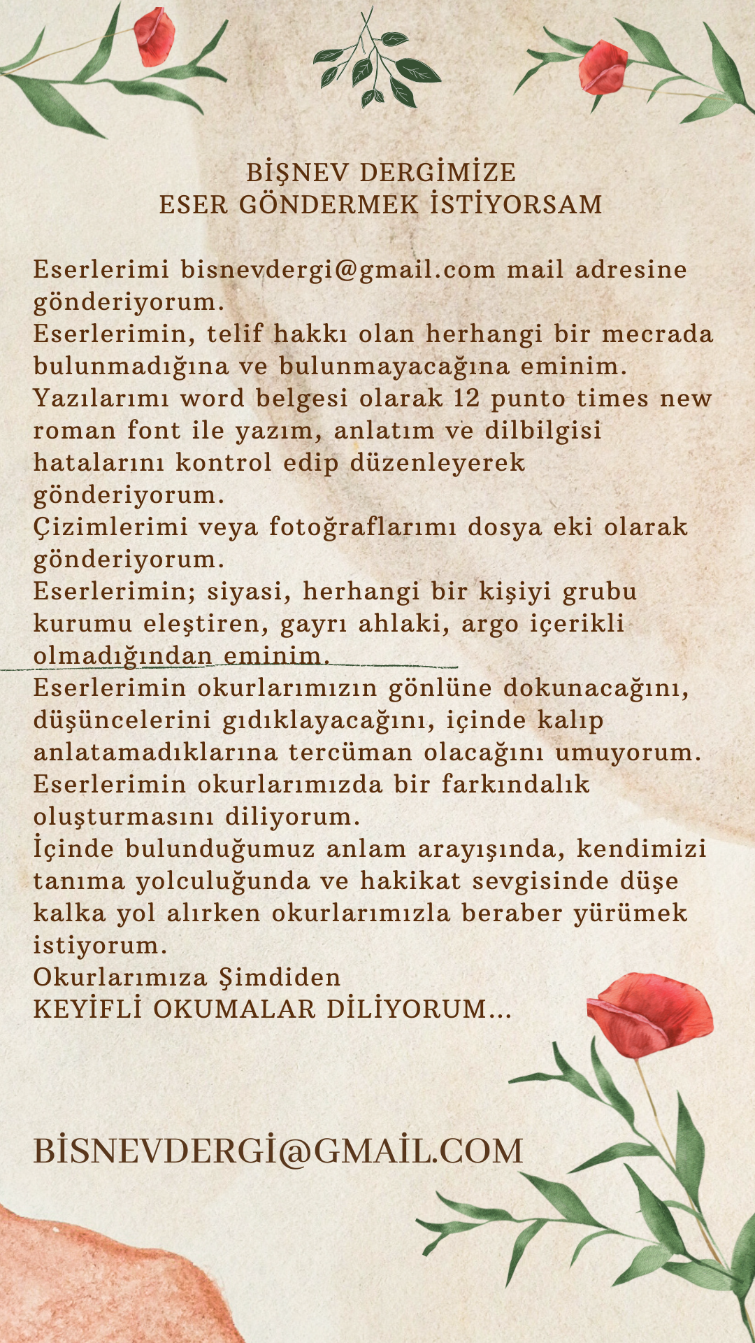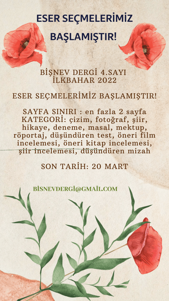 BİŞNEV DERGİ 4. SAYI İLKBAHAR 2022 İÇİN ESER SEÇMELERİMİZ BAŞLAMIŞTIR!bisnevdergi@gmail.com